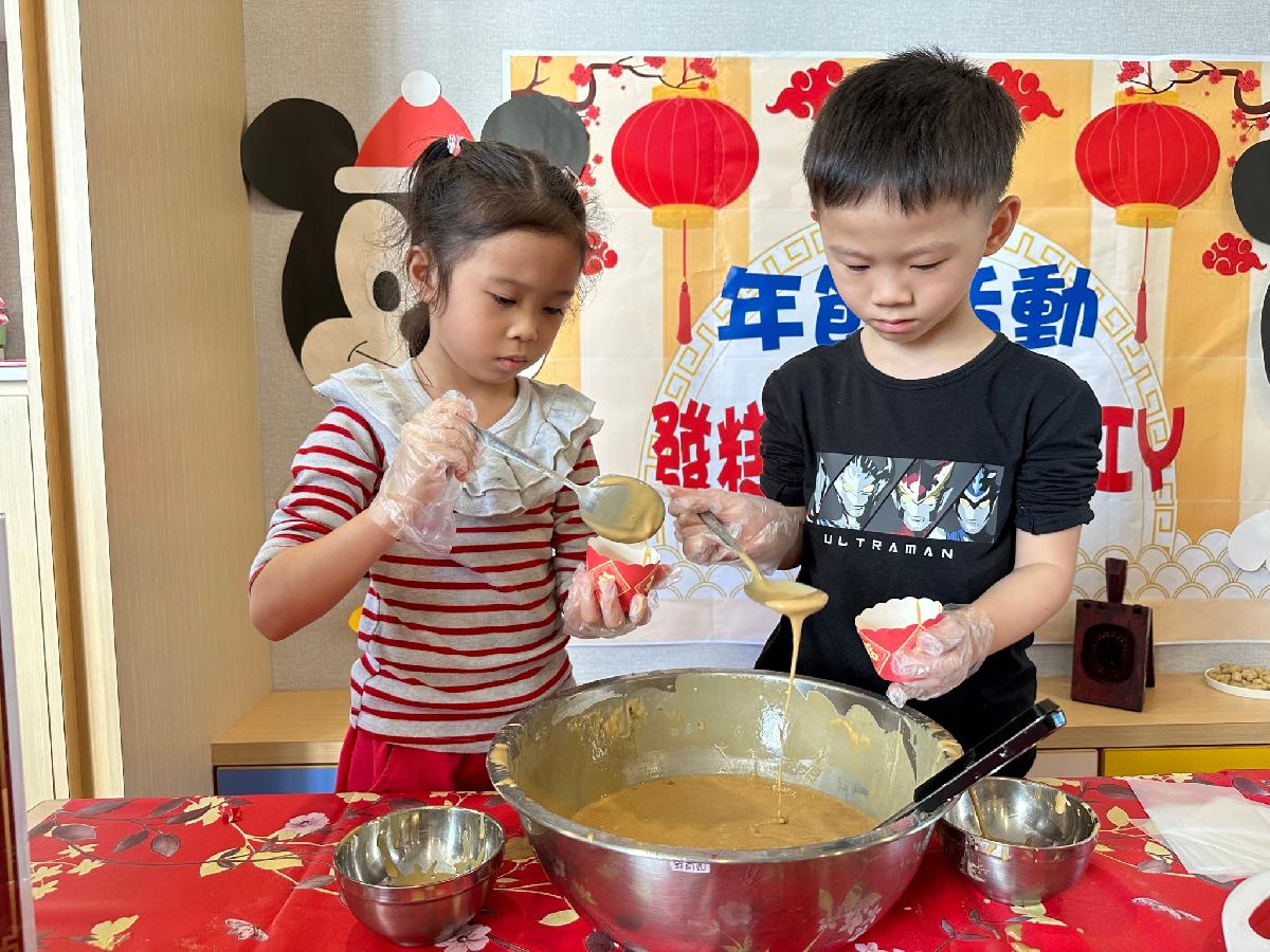 過年的腳步越來越近 過年吃發糕代表招財進寶一路發、紅龜粿代表喜氣長壽的象徵 今日年節活動帶著孩子製作紅龜粿及發糕 老師協助調製發糕粉,孩子發糕粉漿裝進杯子裡,一杯杯發糕看起來可口好吃 經過蒸籠蒸熟後 圓圓可愛的發糕就完成囉! 紅龜粿 利用粿版孩子們 輕輕揉捏 內餡是柔軟甜蜜的紅豆泥 香香甜甜的 孩子製作年節食物 初體驗 也豐富孩子的學習生活